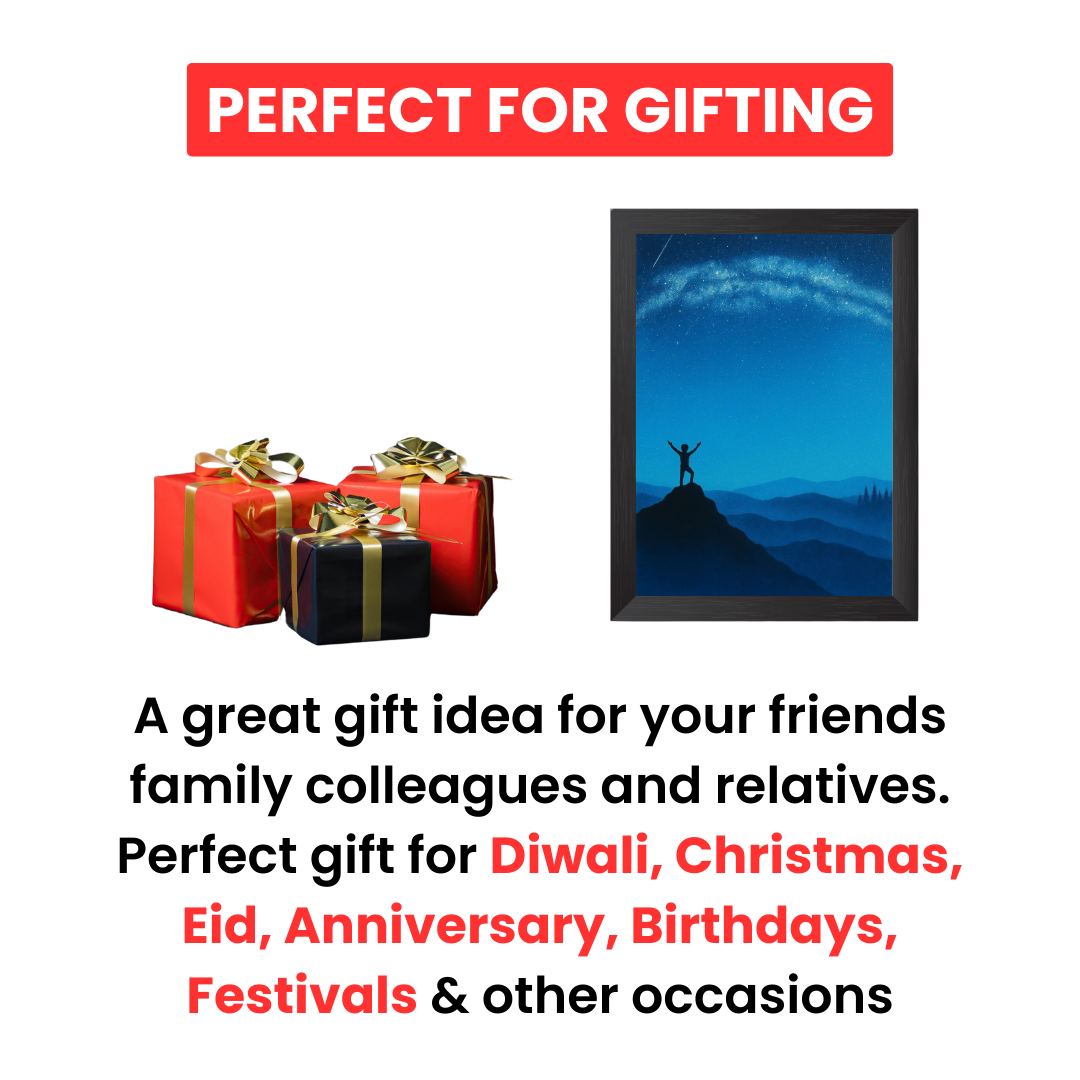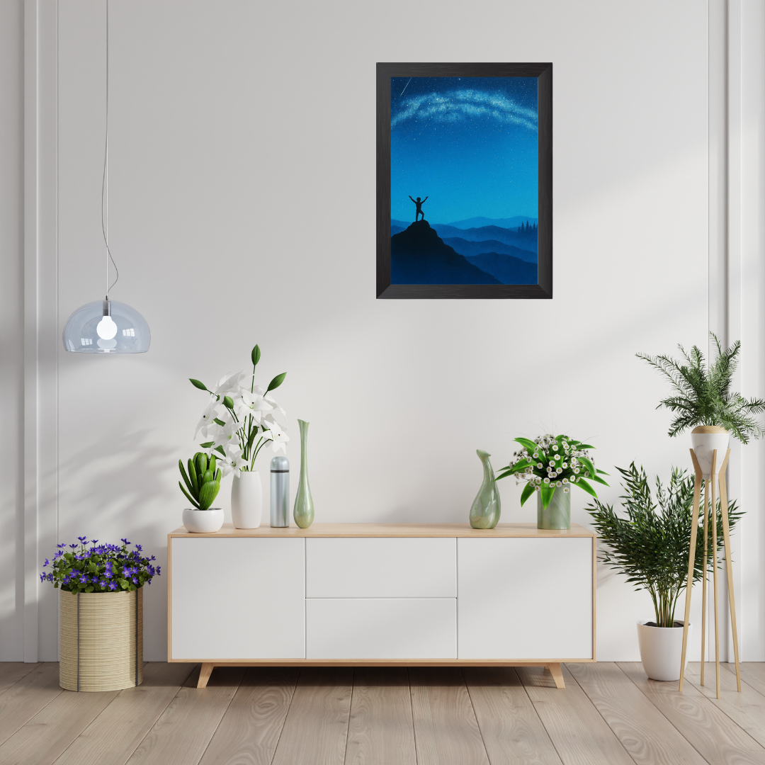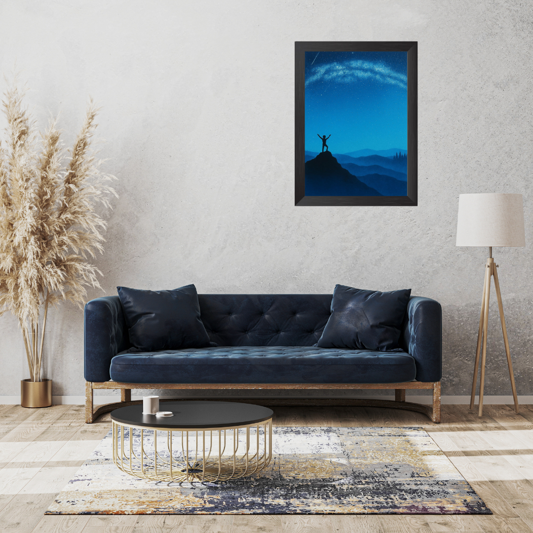 Infuse your space with motivation and wonder through the Conquer the Night Sky Frame, showcasing a striking silhouette of a person triumphantly standing atop a mountain under a breathtaking arc of stars. The deep blues and sweeping cosmic tones evoke both peacefulness and inspiration, perfectly capturing the feeling of achievement, limitless possibilities, and awe for the universe. Ideal for bedrooms, offices, study spaces, or as a meaningful gift, this artwork serves as a daily reminder to reach new heights and embrace positivity. The premium frame ensures both attractive display and lasting durability for years to come[1].